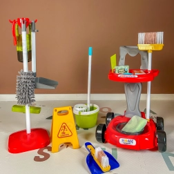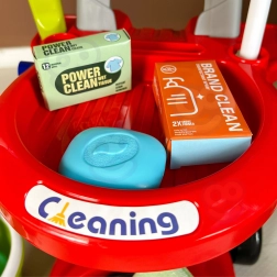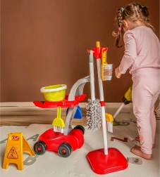 Include tutto il necessario: carrello su ruote, mocio, scopa e spazzolino con paletta, secchio, spruzzatore, panni, cartello di avviso “Attenzione, pavimento scivoloso” e altri accessori. La quantità di elementi offre ai bambini ore di divertimento e favorisce il gioco di ruolo e la collaborazione con fratelli e sorelle.