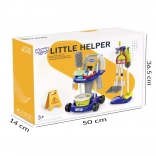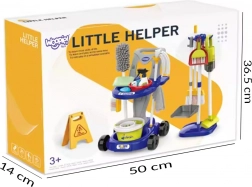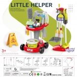 Mocio, scopa, paletta con spazzolino, secchio, panni, spruzzatore e cartello di avviso – tutto ciò di cui i piccoli aiutanti hanno bisogno per imitare le vere pulizie.