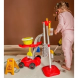 Il carrello rosso con ruote tiene tutti gli strumenti in un unico posto e i bambini possono portarli comodamente dove “puliranno”. Insegna metodo e organizzazione.