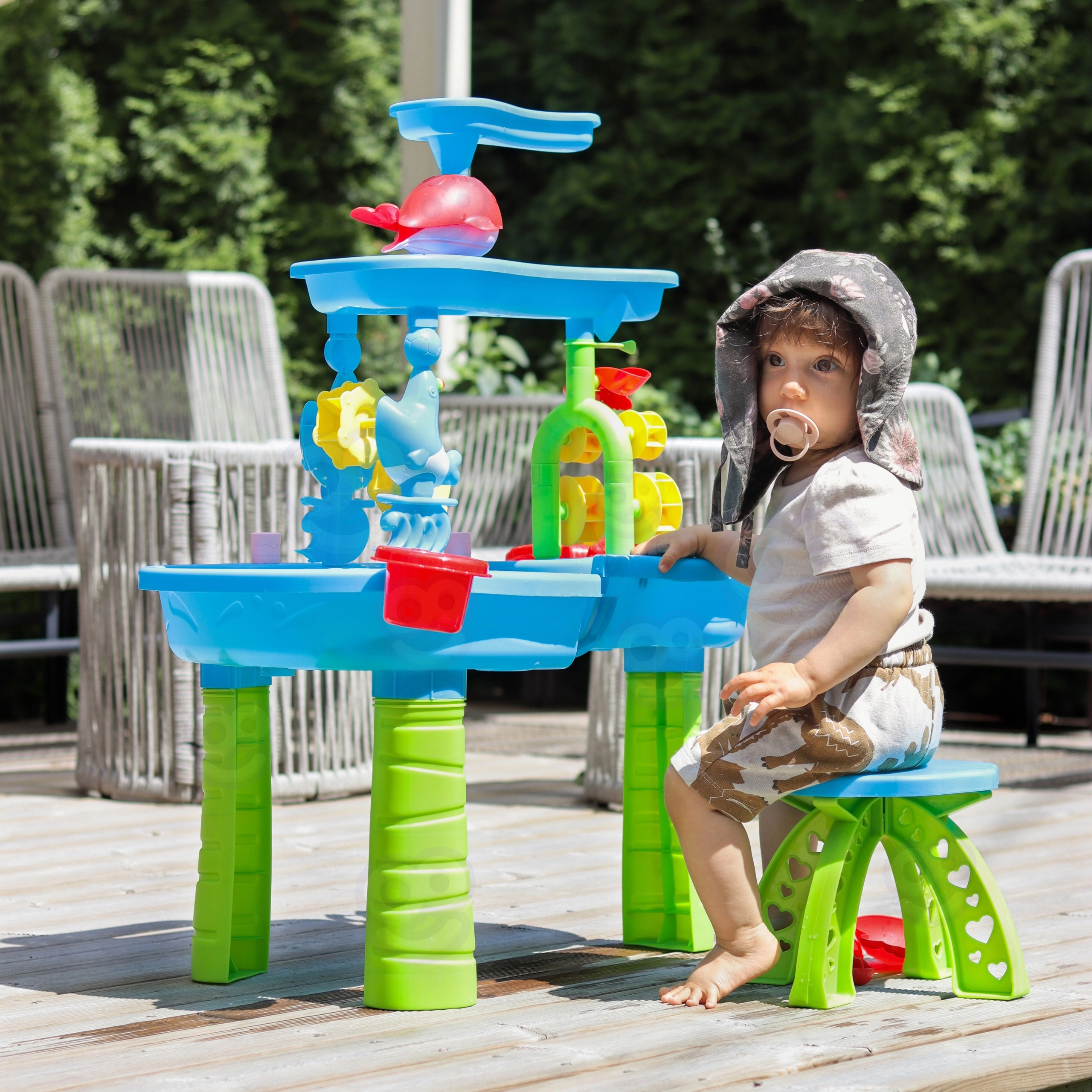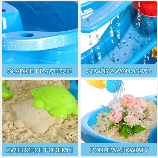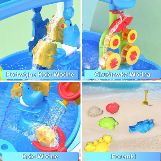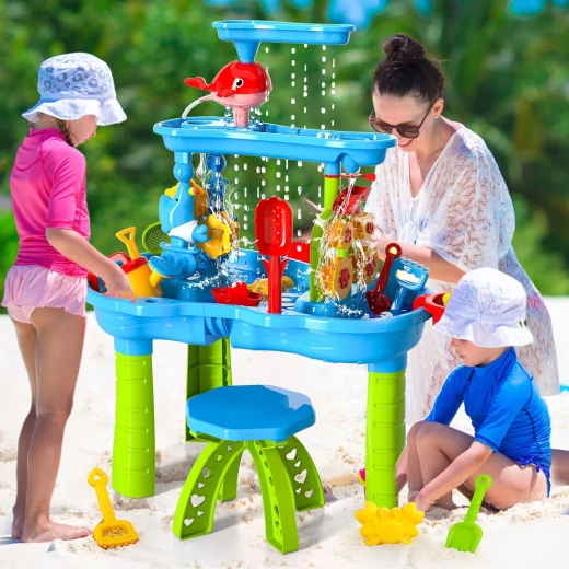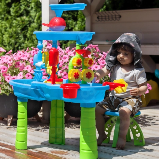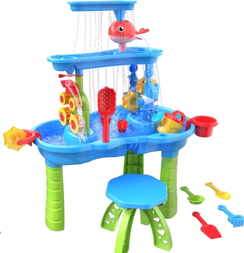 Scopri il divertimento in giardino e in casa con il tavolo multifunzione WOOPIE per giochi con acqua e sabbia. Offre un sistema d’acqua a 3 livelli, ricchi accessori (37 pezzi), montaggio semplice e favorisce lo sviluppo sensoriale e motorio dei bambini.