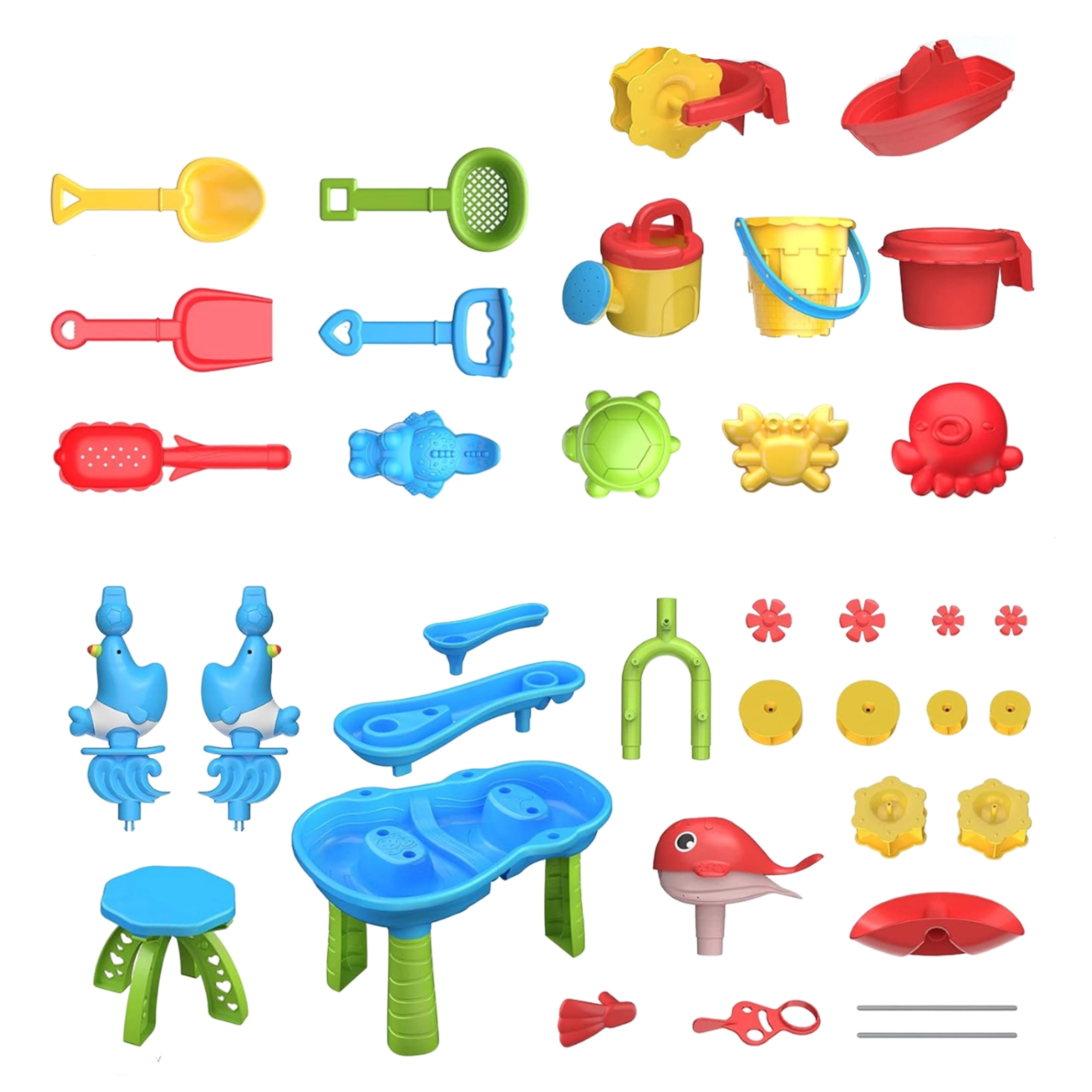 - 2 secchi, annaffiatoio, 5 formine, mulino ad acqua, 5 utensili per la sabbia (paletta, rastrello, setaccio ecc.), tavolo, accessori per il montaggio, sgabello