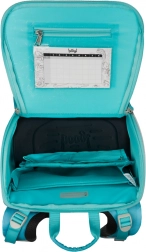 Il sistema di apertura a ribalta consente un facile accesso agli strumenti direttamente dal banco di scuola. L'elastico interno aiuta a mantenere il contenuto dello zaino in posizione.