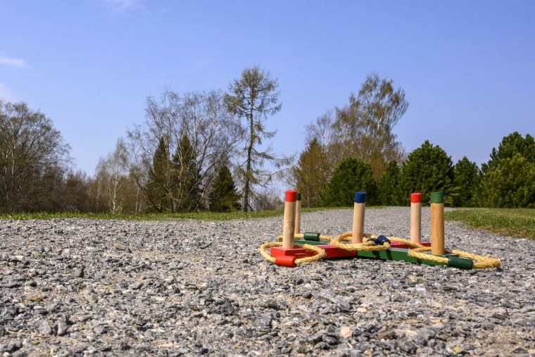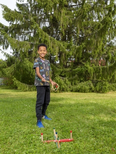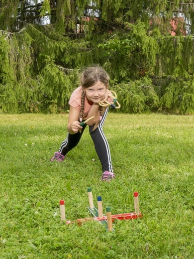 Grazie al legno resistente e ai cerchi leggeri, il gioco è ideale per bambini e adulti. Si trasporta facilmente e si prepara rapidamente per giocare sul prato, in giardino, al parco o in vacanza.