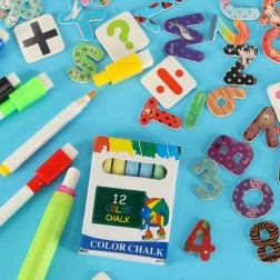 Include vari strumenti didattici come lettere e numeri magnetici, gessetti e pennarelli.