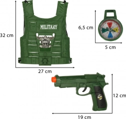 Questo set militare è ideale per tutti i piccoli amanti dell’avventura e dei giochi militari. Con questo set, i bambini possono vivere missioni ed avventure emozionanti. Include: gilet, binocolo, fucile con ricarica meccanica, pistola a batteria, orologio in silicone, maschera per gli occhi, bussola, vero fischietto, piastrina di identificazione militare e fondina per pistola. Ogni elemento è realizzato con materiali di qualità e offre dettagli realistici.