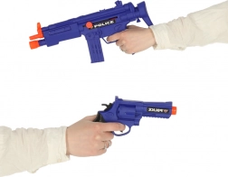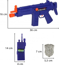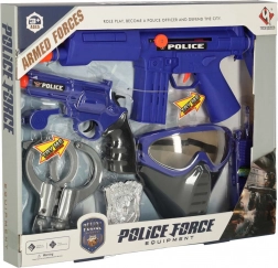 Il set comprende gli elementi base dell'equipaggiamento di polizia, tra cui pistola, carabina, manette, maschera e altri accessori per un gioco realistico.