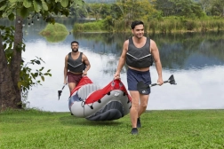 Il kayak è dotato di una pinna centrale rimovibile che aiuta a mantenere la stabilità direzionale. La struttura è progettata per prevenire l'ingresso di acqua nel pozzetto. Per un facile trasporto è dotato di pratiche maniglie, e grazie alla valvola di scarico integrata, il rilascio dell'aria dopo l'uso è rapido e semplice.