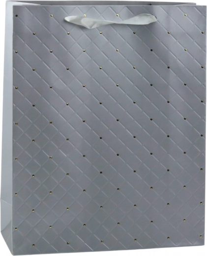 Questa elegante borsa regalo grigia è la scelta perfetta per chi preferisce l'eleganza moderna e l'aspetto classico. Il suo colore tenue, combinato con un motivo geometrico e punti dorati, conferisce un aspetto sofisticato, ideale per matrimoni e occasioni festive.