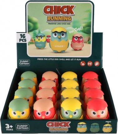 Premi e vai! Il simpatico pulcino con il suo “guscio” colorato parte dopo la pressione grazie al meccanismo a inerzia. Il giocattolo favorisce lo sviluppo della motricità fine, la coordinazione occhio–mano e la naturale curiosità dei bambini.