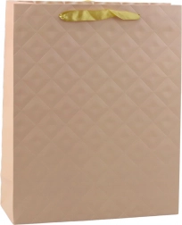 La busta regalo è realizzata in carta rinforzata di alta qualità, la sua superficie è decorata con un motivo geometrico in rilievo che riflette magnificamente la luce. Due varianti, lato anteriore e posteriore, garantiscono che la busta sembri elegante da ogni angolo. I manici in raso in una tonalità chiara donano all'intera composizione un carattere delicato e garantiscono un comodo trasporto.