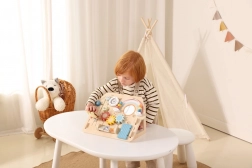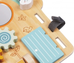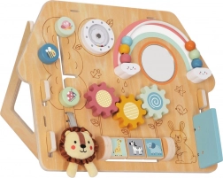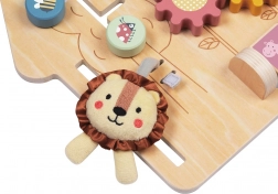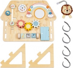 Tavola attiva a forma di casetta con motivo di un leoncino stimola la percezione sensoriale dei bambini grazie ai colori tenui, simpatici disegni e diverse texture superficiali. I bambini amano attività come il labirinto di perline, piastre rotanti e scorrevoli con immagini di animali. Questa tavola da gioco favorisce anche la coordinazione occhio-mano e la fantasia.