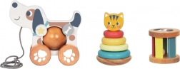 Set motorico divertente per bambini di età a partire da 1 anno. Contiene tre giocattoli per lo sviluppo della motricità fine e della coordinazione, realizzati in legno certificato FSC®.