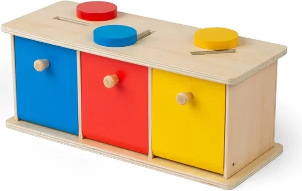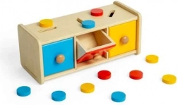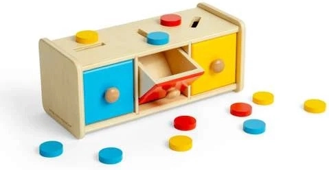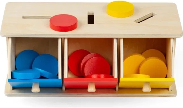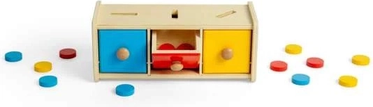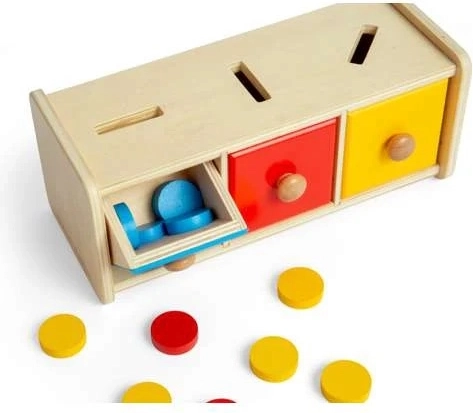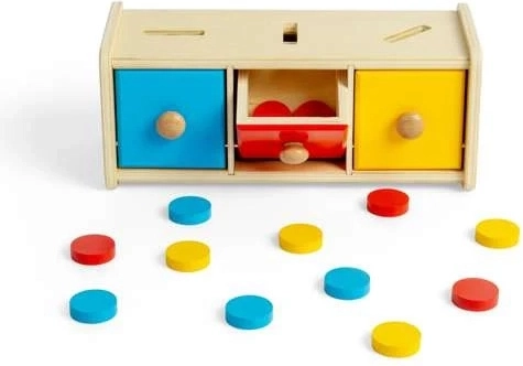 Questa splendida scatola di smistamento offre 15 dischi in tre diversi colori: giallo, rosso e blu, che i bambini devono inserire nei fori corretti. Il giocattolo include anche una scatola in legno con tre cassetti. La scatola di smistamento fa parte del programma educativo Montessori, che motiva i bambini a imparare giocando.