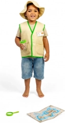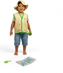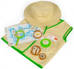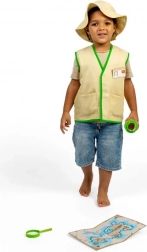 Il costume da esploratore è ideale per sviluppare l'immaginazione e la creatività. Include un gilet, un cappello, un'etichetta con nome, una mappa dettagliata, una lente d'ingrandimento, fossili in legno, una bussola e una lente speciale per osservare gli insetti, garantendo grande divertimento e apprendimento.