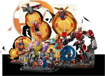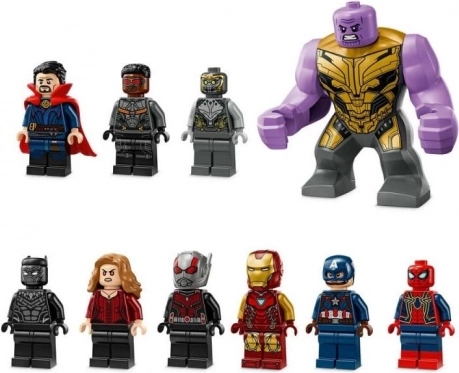 Nove minifigure dettagliate tra cui Capitan America, IRON MAN, SCARLET WITCH, DOCTOR STRANGE, IRON SPIDER, BLACK PANTHER, FALCON e CHITAURI, più la grande figura di THANOS e il mech snodabile di ANT-MAN offrono possibilità di storia illimitate.
