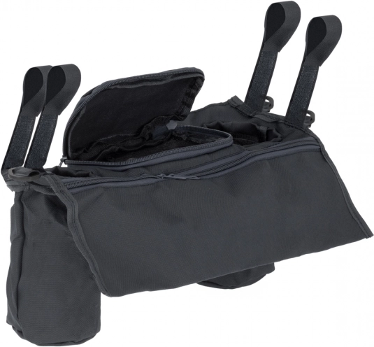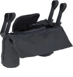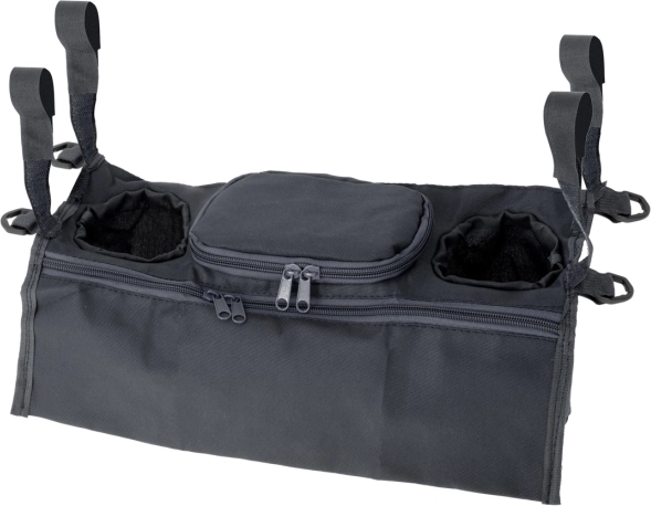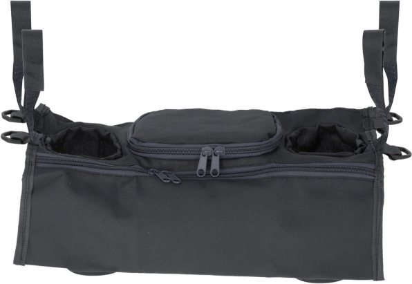 Il fissaggio semplice con chiusure a strappo sui lati mantiene l’organizer stabile sul maniglione. Due ampi scomparti per bevande con diametro di circa 7 cm e altre tasche per piccoli oggetti offrono spazio sufficiente per tutto ciò che serve avere a portata di mano.
