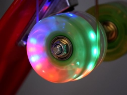 Le ruote sono realizzate in materiale durevole con un rivestimento in gomma, assicurando un'ottima aderenza e assorbimento delle vibrazioni. I LED integrati che si accendono durante la corsa, conferiscono allo skateboard un aspetto unico e aumentano la visibilità dell'utente, senza bisogno di batterie! I diodi sono alimentati dall'energia magnetica generata dalla rotazione delle ruote.