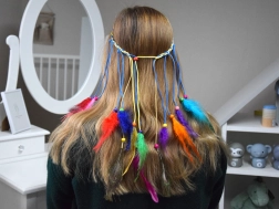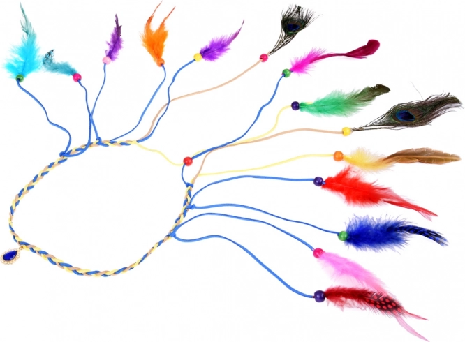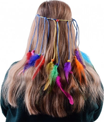 Aggiorna il tuo stile con colori vivaci grazie a questa splendida fascia per capelli boho. È realizzata con piume leggere e colorate in tonalità intense - dal turchese e giallo al rosso e verde. Combinazione con piccole perline di legno e sottili trecce creano un aspetto accattivante e naturale.