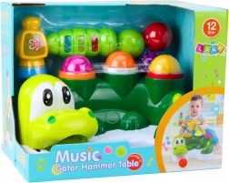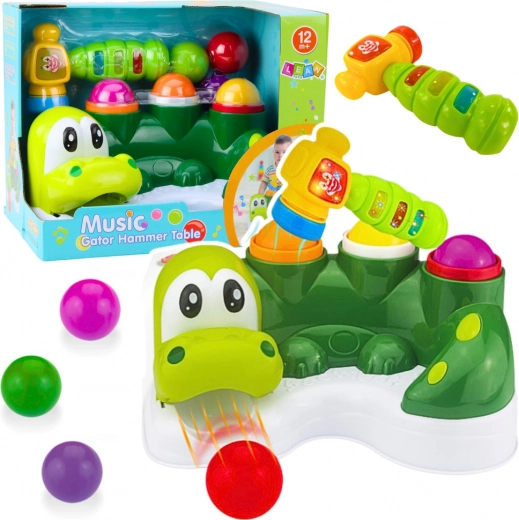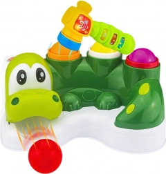 Il bambino usa il martello per colpire le palline colorate, che entrano dentro il giocattolo e vengono espulse dalla bocca mobile del coccodrillo, creando uno scivolo divertente. Il martello interattivo si illumina, suona melodie ed emette altri suoni premendo un pulsante speciale con il clown.