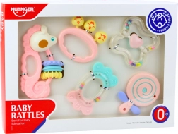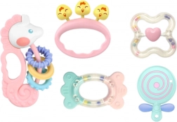 Il set comprende 5 elementi diversi che funzionano sia come massaggiagengive che come sonagli. Grazie a varie forme, colori e trame, il bambino impara a riconoscere suoni, forme e materiali, sviluppando al contempo la sua coordinazione visiva e motoria e i sensi del tatto, dell'udito e della vista. La forma ergonomica e la leggerezza dei componenti consentono al bambino di afferrarlo e tenerlo facilmente in mano il giocattolo.