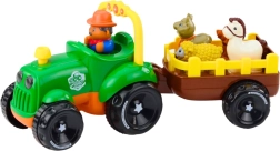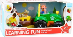 Il giocattolo è dotato di tre diverse melodie e durante il viaggio le luci anteriori del trattore lampeggiano, attirando ulteriormente l'attenzione del bambino. Il trattore si muove senza problemi e tira il rimorchio, che presenta spazi appositamente contrassegnati per le figurine degli animali. Ogni animale si adatta solo a uno spazio, e il suo corretto posizionamento attiva il suono corrispondente. È un ottimo modo per sviluppare il pensiero logico, le associazioni e l'apprendimento dei suoni degli animali.