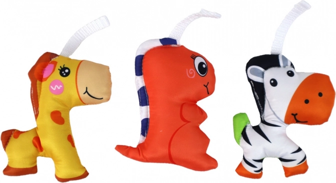 L'elemento centrale comprende tre giocattoli di peluche colorati – zebra, giraffa e dinosauro rosso, che ruotano all'avvio della giostrina. Il loro movimento attira l'attenzione del bambino e incoraggia l'osservazione, influenzando positivamente lo sviluppo della coordinazione occhio-mano. I colori vivaci, le forme amichevoli e il tessuto morbido stimolano la vista, il tatto e l'immaginazione del bambino.