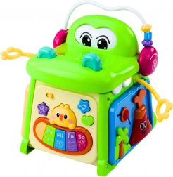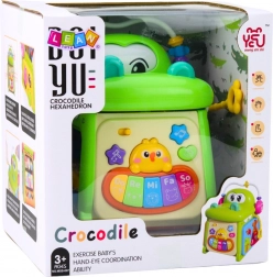 Il cubetto interattivo coccodrillo è dotato di un pianoforte con tasti colorati "Do, Re, Mi, Fa, Sol", componenti mobili per la manipolazione e un orologio con lancette movibili. Ogni lato del cubo offre diverse attività, mantenendo l'interesse del bambino per un lungo periodo. Con angoli arrotondati e componenti di grandi dimensioni, il giocattolo è sicuro e aiuta lo sviluppo delle abilità manuali.