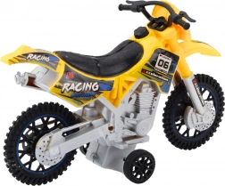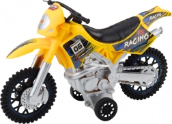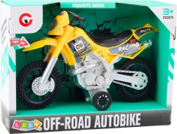 Questa moto è realizzata in plastica resistente, capace di sopportare un gioco intenso. Il colore giallo e gli adesivi da corsa forniscono un aspetto attraente, mentre le grandi ruote fuoristrada offrono stabilità su superfici irregolari.
