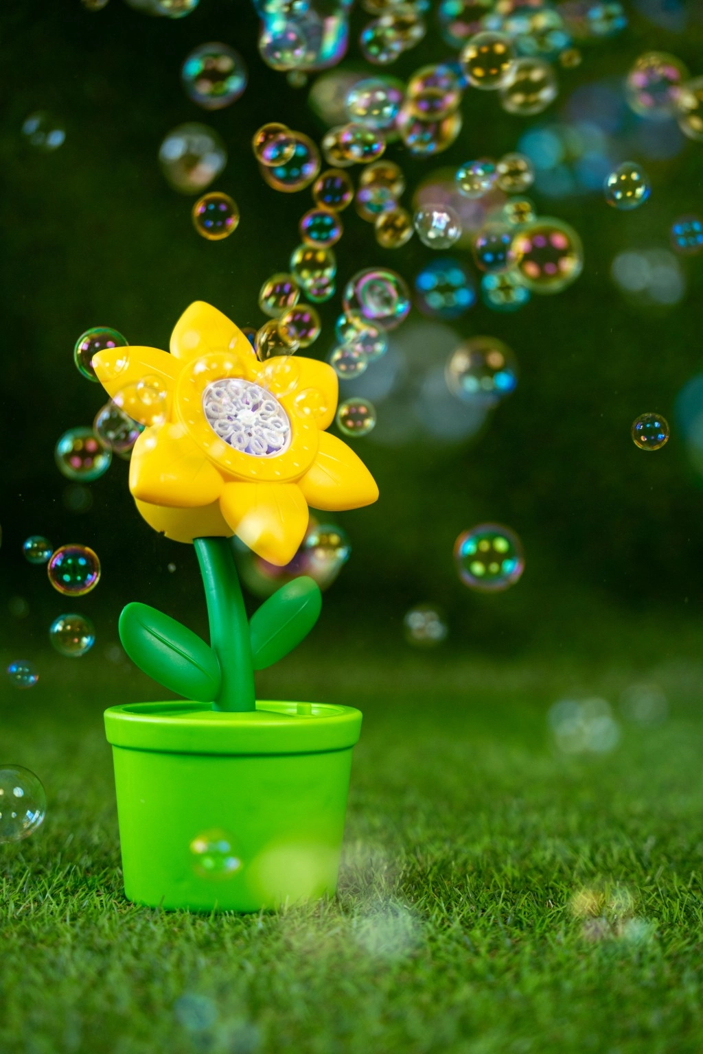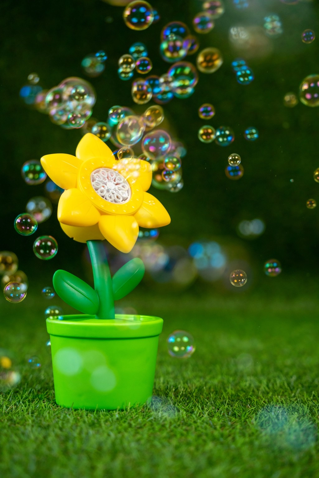 Il design a forma di fiore giallo in un vaso verde colpisce a prima vista e trasforma ogni gioco in uno show allegro pieno di bollicine.