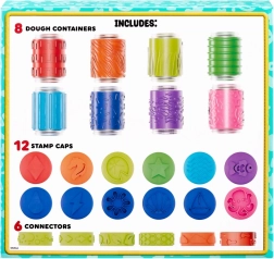Ogni contenitore fa parte del gioco, permettendo la creazione di motivi interessanti e l'uso di timbri e altri accessori. Il set contiene 8 tubi di plastilina, 12 coperchi con timbri divertenti e 6 connettori con motivi diversi per la creazione creativa.