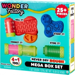 Il set Wonder Factory Never Dry Dough Mega Box include la nostra plastilina speciale, che non si asciuga mai, è rispettosa dell'ambiente e ha un profumo meraviglioso. Offre anche un utensile universale 4 in 1 con cui puoi:
