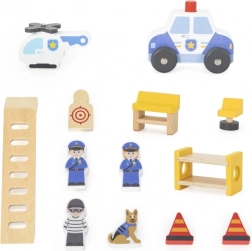 Il set comprende personaggi di poliziotti, un ladro e un cane, oltre a un’auto della polizia, un elicottero, coni e accessori per interventi d’azione.