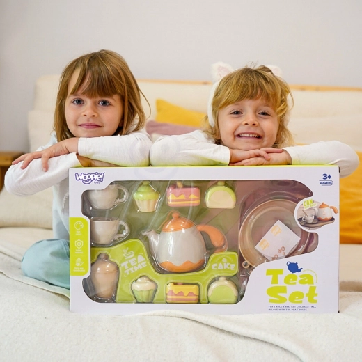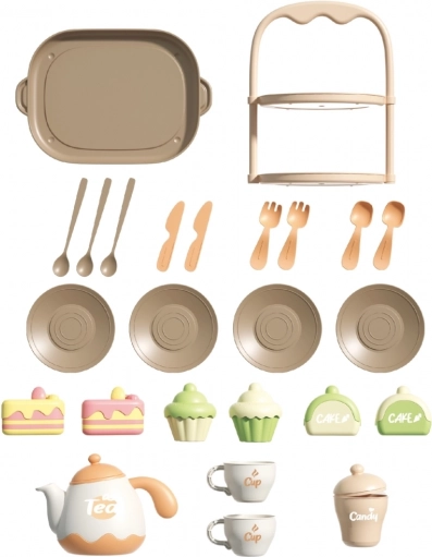 Teiera, tazzine, piattini, vassoio e alzata per dessert: i bambini possono versare il tè e servire le bontà come in un vero ricevimento.