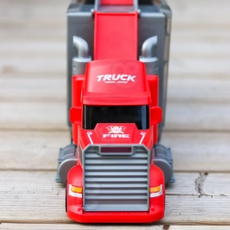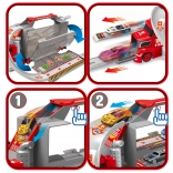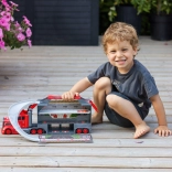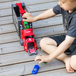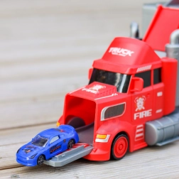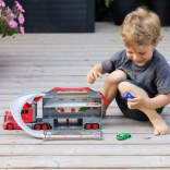 Questo camion multifunzione dal design dei pompieri funge da trattore da trasporto e, una volta aperto, si trasforma in un set di gioco completo con garage, posti auto e pista dinamica. Grazie al lancia-auto, i bambini possono far partire le gare in un attimo.