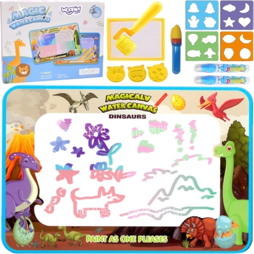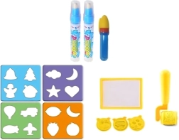 Il set include pennarelli ad acqua, timbri, rullo, stencil e vaschetta per l’acqua per rendere i disegni più vari e l’apprendimento di numeri e lettere più divertente.
