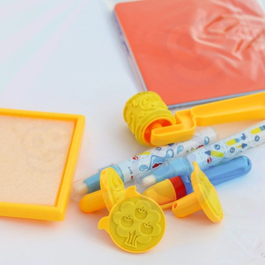 - 2× pennarello ad acqua, timbri, rullo con motivi, stencil di forme, vaschetta per l’acqua, istruzioni d’uso