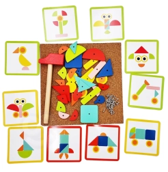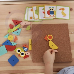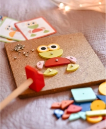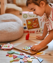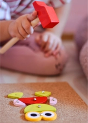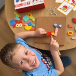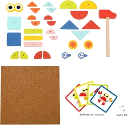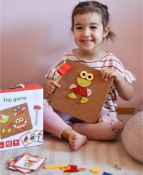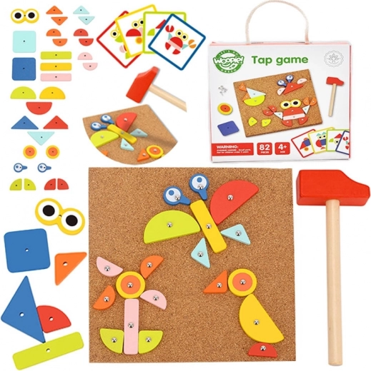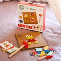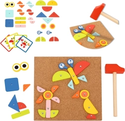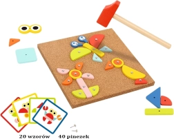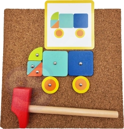 Il giocattolo a martello Woopie Green è un ottimo modo per stimolare la creatività e il pensiero logico dei bambini. Il set è composto da 30 blocchi di legno, 10 carte a doppia faccia con 20 modelli suddivisi in tre livelli di difficoltà, 40 puntine, una tavola e un martello. I bambini cercano di riprodurre fedelmente l'immagine dalla carta usando blocchi di forme e colori diversi, oppure possono creare i propri disegni seguendo la propria fantasia e creatività.