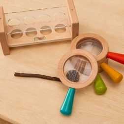 Il set è dotato di un supporto in legno con coperchio trasparente, che facilita lo stoccaggio e protegge le lenti d'ingrandimento. I bambini sono incoraggiati nella loro curiosità e apprendimento attraverso il gioco, il che contribuisce allo sviluppo delle capacità di osservazione.
