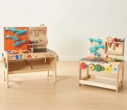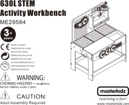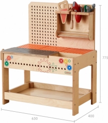 L'officina STEM in legno permette un divertimento creativo e l'esplorazione del mondo della scienza. I bambini possono creare bellissimi disegni usando pioli colorati e geometrici, viti e ingranaggi. L'altezza del tavolo di 42,5 cm è ideale per i bambini dai 3 anni in su.