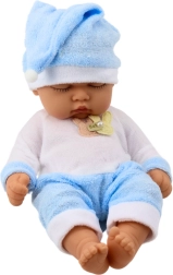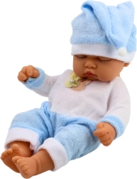La bambola ha una dimensione compatta di circa 24 x 12 cm, perfetta per le mani dei bambini. Il pigiama è realizzato in un morbido materiale di un bel colore blu, completato da un adorabile cappellino con pompon. La piccola stampa sulla maglietta con il motivo del ciuccio conferisce alla bambola un delicato fascino infantile.