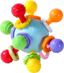 Il sonaglio incorporato emette un suono delicato durante il movimento, supportando lo sviluppo dell'udito e attirando l'attenzione del bambino. Le dimensioni compatte e le impugnature progettate per le piccole mani consentono una presa facile, rotazione e compressione, allenando così la coordinazione e la forza della presa.