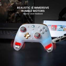 Collega il controller come preferisci: 2,4 GHz per latenza minima, Bluetooth per un abbinamento rapido oppure cavo per la massima stabilità. I motori di vibrazione asimmetrici aggiungono un feedback aptico realistico e i micro-switch frontali di livello e-sport assicurano pressioni rapide e sicure. Effetti RGB personalizzabili e cambio profili rapido ti permettono di adattare il controller alla tua partita e al tuo stile.