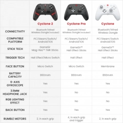 Vivi un controllo preciso e prestazioni al top con il controller GameSir Cyclone 2. Offre connessione a tre modalità (2,4 GHz, Bluetooth, cavo), leve Mag-Res TMR, grilletti analogici con effetto Hall, giroscopio a 6 assi, vibrazioni immersive e illuminazione RGB per console SWITCH, PC, Android e iOS.