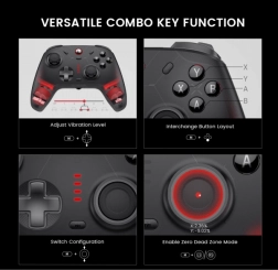 Grazie alla connessione a tre modalità (2,4 GHz, Bluetooth, cavo) scegli facilmente il metodo ideale di gioco con latenza minima. Il giroscopio a 6 assi supporta il controllo tramite movimento su SWITCH, i motori vibranti asimmetrici offrono un feedback realistico e i pulsanti frontali e-sport con microswitch assicurano pressioni rapide e sicure. Gli effetti RGB personalizzabili e il rapido cambio dei profili aggiungono stile e flessibilità alla tua esperienza.