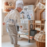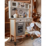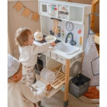 Questa cucinetta in legno WOOPIE GREEN è progettata per piccoli chef ed esploratori. La parte frontale offre una ricca area culinaria con macchina da caffè, microonde, lavello, forno, lavastoviglie e piano cottura a induzione con luci e suoni. Sul lato si trova una pratica lavatrice con cesto per il bucato, che insegna in modo giocoso le routine quotidiane. Il retro nasconde una lavagna a gessetti e una mappa del mondo colorata per disegnare, conoscere i continenti e stimolare la fantasia.