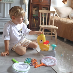 Prova il gioco di abilità Acchiappa Frisbee con lanciatore di dischi del marchio WOOPIE! Divertimento fantastico per tutta la famiglia, che potenzia le tue abilità e coordinazione. Afferrate il disco lanciato dall'anatra e godetevi la competizione con amici e familiari.