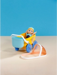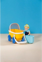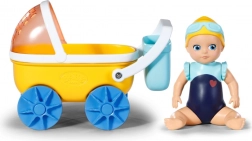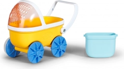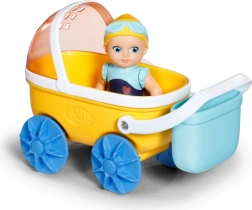 - Passeggino giallo, ruote e cestino blu, bambola con costume blu