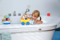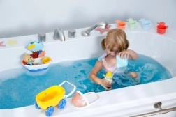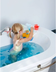 La struttura in plastica resistente, le forme arrotondate e i colori vivaci stimolano la percezione sensoriale e la motricità fine. Il set è ideale per bagno, piscinetta e gioco al lavandino e, grazie al cestino removibile, si pulisce facilmente ed è versatile nell’uso.