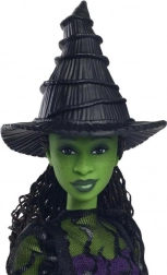 La bambola ha un aspetto iconico dal film con un viso verde dettagliato, trecce e un cappello da strega.
