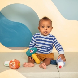 Il trapano a forma di sonaglio è l'accessorio ideale per i piccoli artigiani. Il bambino amerà il gioco e l'imitazione della vera perforazione, proprio come il tuttofare Cagnolino Jules. Questo sonaglio è progettato per stimolare i sensi dei bambini e stimolare la loro immaginazione e imitazione attiva.